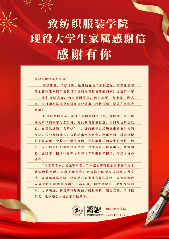 一直以来,800全讯白菜网十分重视入伍学生在部队的发展,时刻关心服役学生的家庭状况,学院对目前在役学生9位学生家属进行了电话慰问,关心关爱其生活和家庭情况,在春节来临之际向入伍学生家属寄出慰问信和节日慰问品,送去学校和学院的温暖和爱护,在役学生家属纷纷对学院的关心表达了衷心的感谢。