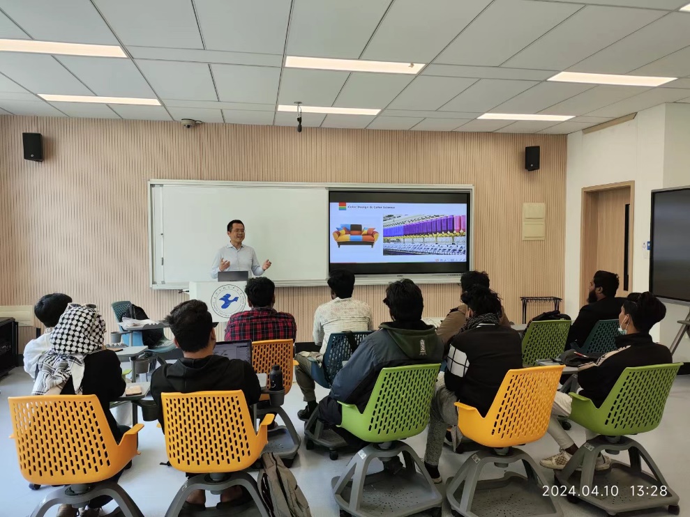 4月10日下午,蔚谱光电(上海)有限公司总经理王彬宇先生受邀走进《颜色技术原理(全英语)》课堂,以Color Digitalization in Industry为题在教学楼C207为纺织工程国际班的留学生们带来了一场别开生面的全英语讲座,旨在带领学生了解颜色测量的数字化技术和设备、颜色数字化发展及前沿应用。
