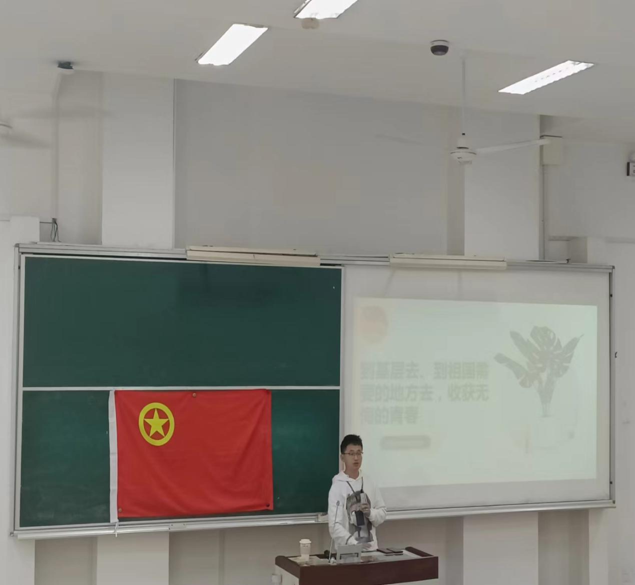 会上,唐全老师讲述了他援滇半年的故事。在滇期间唐全老师服务于云南省红河州蒙自市第三中学,是第26批上海青年志愿者助力乡村振兴赴滇服务接力队的总队长。他关注乡村教育和文化发展,通过自己的努力和奉献,以乡村振兴为目标,在云南志愿服务期间,积极搭建资源,将上海先进的教育理念和教育方法引进基础教育薄弱的学校,他和接力队成员为山区孩子们竭尽全力开展支教和公益活动,帮助孩子们度过温暖的冬天,在关注青少年身心健康成长的同时,积极争取各类资源,筹备总队活动。同时,唐全老师号召大家作为青年学生,要拥有勇当先锋,胸怀壮志,敢拼敢奋斗的精神,用实际行动追随党的脚步,为社会做出贡献。让奋斗成为青春最亮丽的底色;追梦起航:眼中有山河,心中有人民,手中有本领。