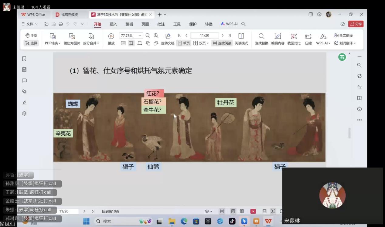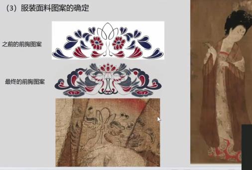 讲座中,侯凤仙教授以获第一届“华夏衣裳·唐风”中国传统服饰三维数字复原设计大赛最佳人物造型表现奖的作品——《簪花仕女图》为例,讲述其创作过程,对历史文献资料进行深入研究是设计的首要任务,其次分别确定数字人偶、面料图案、服装版片,最后结合3D设计整体表现完成整个设计流程。此作品将唐代服饰的特点呈现得栩栩如生,创造出独具魅力的三维华服造型。侯老师通过虚拟技术再现历史名作的尝试,为服装史教学的可视化以及研究者的学习提供了参考。