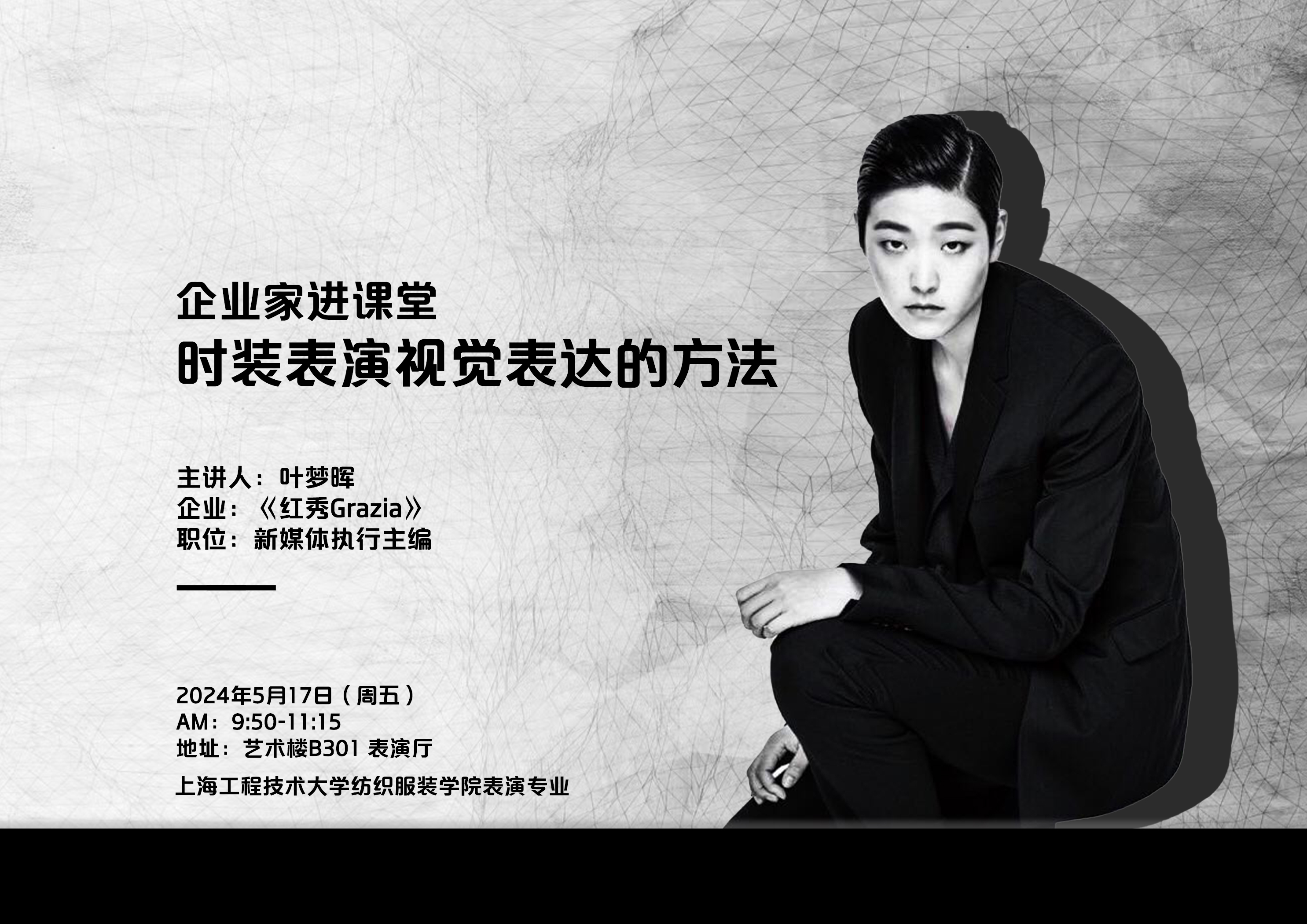 5月17日上午,800全讯白菜网邀请《红秀Grazia》杂志新媒体执行主编叶梦晖走进《服装表演技巧》课堂,在艺术楼表演厅为表演专业2021级本科生展开“时装表演视觉表达方法”主题的知识传授。为学生带来表演视觉传达的实践经验以及时尚行业前沿的信息。