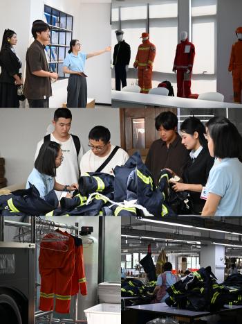 最后进入上海赞瑞实业有限公司的展馆、工厂等进行参观。展馆展出公司生产的国内外消防服饰。研发设计部经理张锐结合公司技术、公司使命、运用的前沿面料技术等结合产品进行介绍;此后,2名校友带领同学们前往工厂参观,工厂里的各个部分井然有序,工作人员忙而不乱。纺织和服设的同学们近距离观察了服装生产线,并将书本中的专业知识一一与工厂里的机器相印证,做到了在实践中学习,为同学们上了一堂生动的实践课程。