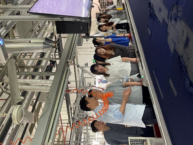 学生第一党支部师生进入上海宝鸟服饰公司工厂参观,工厂内摆放着井然有序的机器,来往间是忙中有序的工作人员。同学们近距离观察服饰生产线,了解到各个机器的功能以及服饰打板、布料切割等生产细节。