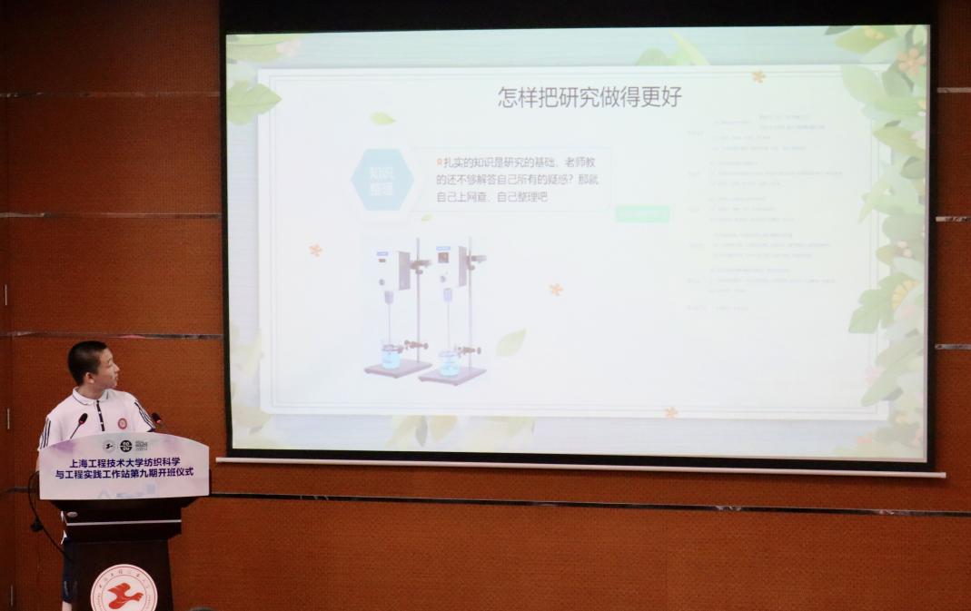 来自上海外国语大学附属外国语学校松江云间中学的陈益全同学作为第八期优秀学员代表发言。他表示在工作站学习中首次接触到了纺织科学的奥秘,同时他还鼓励第九期的学员们勇于探索,勇攀科研高峰。随后,工作站各课题指导教师逐一为学员们介绍了本期课程的具体内容和教学安排。