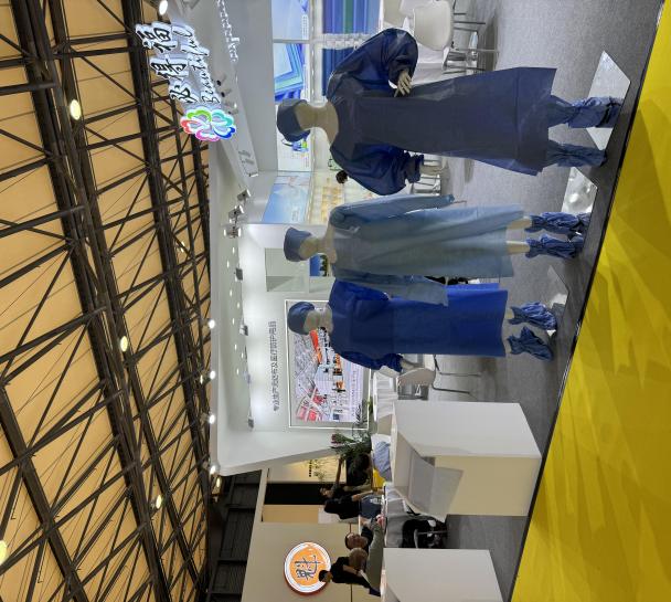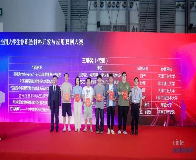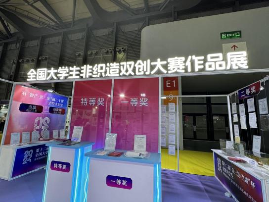 展览会上展示了第十二届“金三发·当盛”杯全国大学生非织造材料开发与应用双创大赛获奖作品,我院2023级非织造专业同学的作品也获得本次大赛三等奖,同学们看到了同龄人设计的优秀作品,赞叹不已。