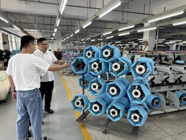 孙主管首先带领团队参观企业,并对公司规模、产品以及研发情况进行详细介绍。公司成立于1991年,是一家有着多年丰富经验的弹性织带制造商,拥有先进的专业设备和成熟的工艺技术。生产流程涵盖倍捻、包覆,纱线染色,针织、织,经编,连续染色、印花等全部工序。公司与江南大学、南通大学以及当地职业院校有广泛的合作。