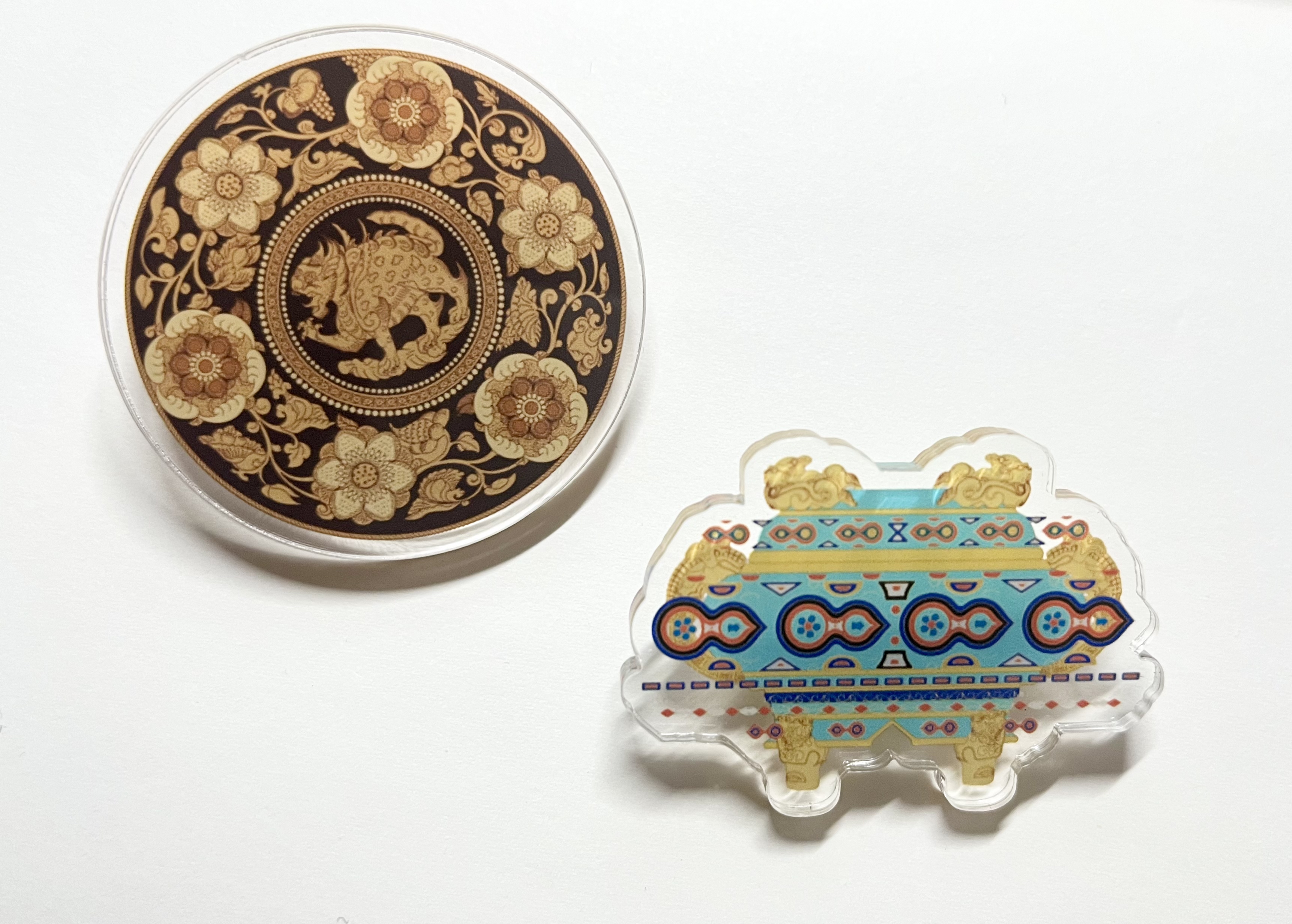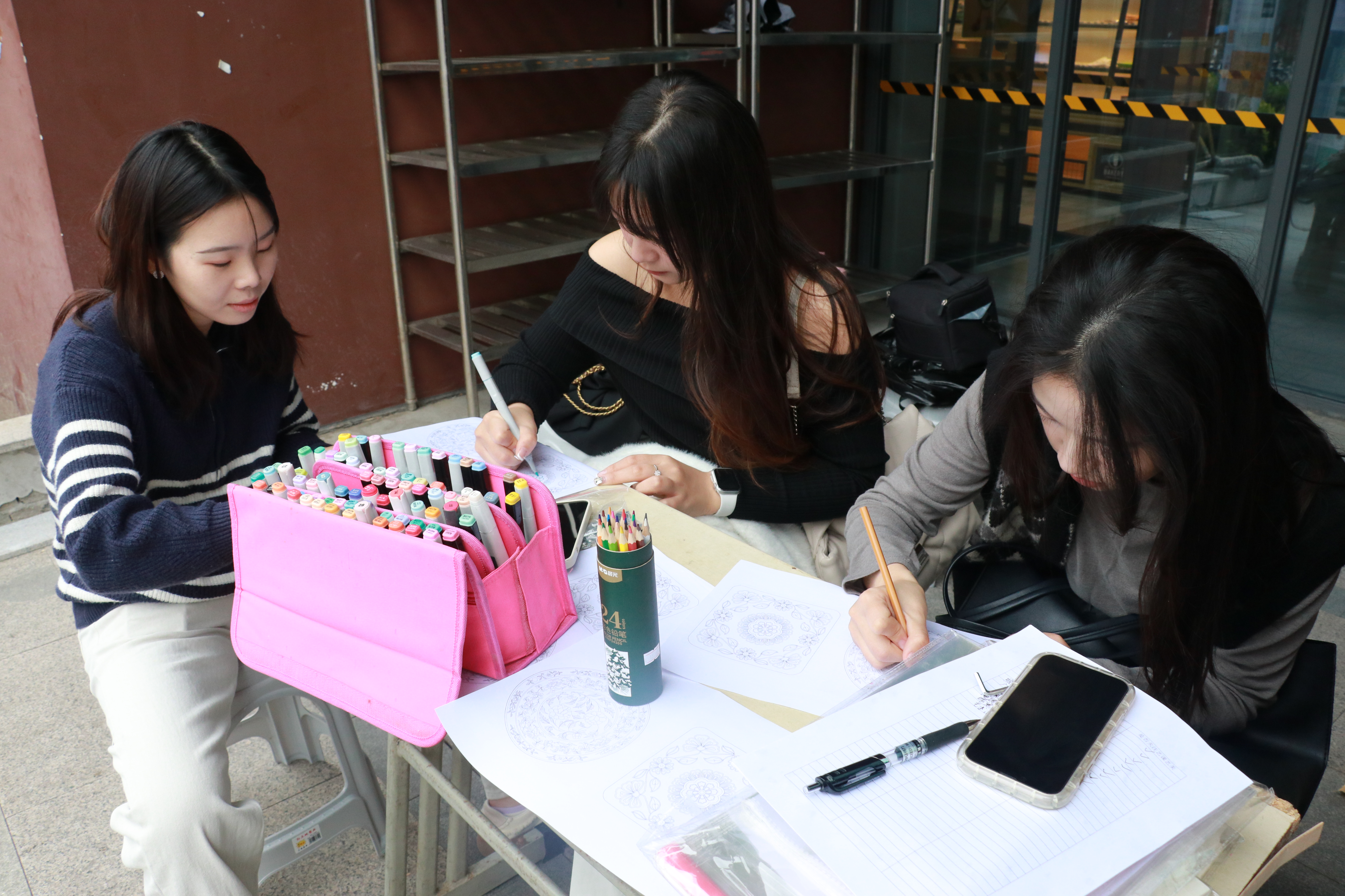 除静态展外本次展览增加互动交流和体验环节,在活动现场设置志愿者讲解、纹样上色体验区与相关文创礼品分发区。志愿者结合展板内容向观展师生简单介绍植物纹样、动物纹样、几何纹样、组合纹样等经典传统纹样的历史文化和设计要素;听完讲解感兴趣的学生可前往体验区亲自尝试对传统纹样进行上色,感受传统文化的魅力;策划团队也结合展览纹样制作了十余种胸针与钥匙扣文创礼品,观展结束后学生可结合对纹样初步的了解和自己的喜好领取。